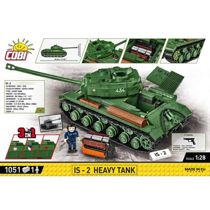 De IS-2 tank werd in 1943 ontwikkeld als opvolger van eerdere modellen zware tanks die in het Rode Leger dienden. Zijn bemanning bestond uit 4 personen. De belangrijkste bewapening was een 122 mm kanon dat door het pantser van de beste Duitse tanks zoals de Tiger en Panther kon dringen. De IS-2 speelde een belangrijke rol in de Slag om Berlijn, waar hij bijdroeg aan de uiteindelijke nederlaag van het Derde Rijk. Extra functionaliteiten van het model zijn onder meer het kanon en de koepel, die kunnen worden verplaatst, toegang tot luiken voor de bemanning en werksporen. De set bevat ook stenen met de markeringen van drie landen! Dit zijn Polen, Tsjechoslowakije en de Sovjet-Unie. Het is aan jou om te beslissen met welke kleuren je de tank gaat bouwen!