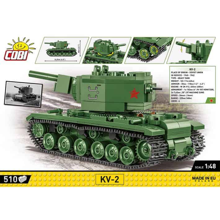 Dit is de KV-2 Sovjet zware tank uit de Tweede Wereldoorlog. Het werd ontworpen en in productie genomen van 1939-1941. De naam “KV” is een afkorting van “Kliment Voroshilov”, de achternaam van een militaire commandant van de Sovjet-Unie. De bemanning van de tank bestond uit 6 soldaten. Het voertuig werd geplaagd door veelvuldige pech en was erg zwaar en langzaam. Deze tekortkomingen werden echter gecompenseerd door het krachtige 152 mm kanon, dat in staat was elke vijandelijke tank te vernietigen, ongeacht de dikte van zijn pantser. De KV-2 was ook zwaar gepantserd. In feite zou alleen een voltreffer van het 8,8 cm Flak-luchtafweergeschut het kunnen vernietigen!
