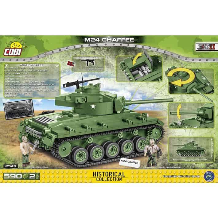 De M24 Chaffee was een lichte Amerikaanse tank uit de Tweede Wereldoorlog uitgerust met gelast pantser, twee motoren en een 75 mm kanon, dat eerder was ontworpen voor de B-25 Mitchell-bommenwerper. Het model heeft werkende rupstractie, een roterende koepel en een beweegbare loop. Onder de serviceklep die open kan, vind je twee van stenen gebouwde motoren. Op de koepel bevindt zich een te openen luik en een machinegeweer.