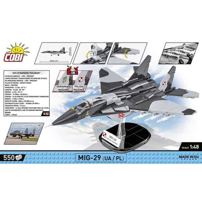 MiG-29 (NAVO-code: Fulcrum) is een moderne Sovjet- (nu Russische) jager, geproduceerd sinds 1983. Sinds 1989 zijn vliegtuigen van dit type in dienst bij de luchtmacht van de Republiek Polen. In 2023 droeg Polen een deel van zijn MIG-29-vloot over aan het vechtende Oekraïne. Het 2-in-1 blokmodel bevat twee sets markeringen voor respectievelijk Polen en Oekraïne, waardoor de bouwer vrij is om het land te kiezen.