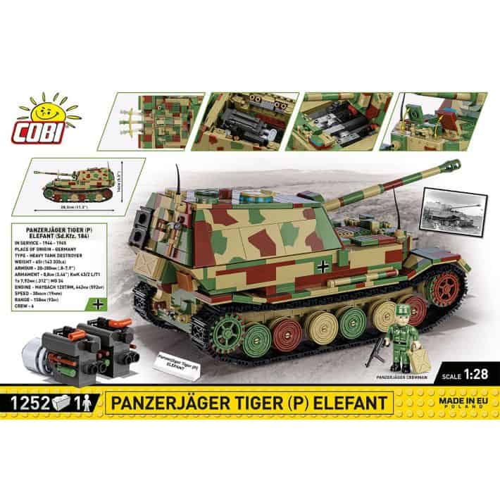 De Elefant was een zwaar gepantserde kanon-/tankvernietiger die door de Duitsers werd gebruikt tijdens de Tweede Wereldoorlog. De functionaliteiten van het model omvatten een verwijderbare blokreplica van de motor, werkende rupsbanden, een kanon dat verticaal en horizontaal kan worden bewogen, nagemaakte interieurelementen en te openen luiken. De set bevat ook een gedetailleerd figuur van een bemanningslid van een voertuig met accessoires zoals een machinepistool en een bus.