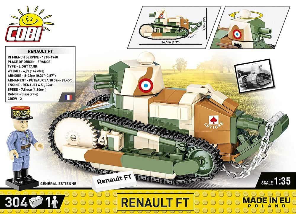 De Cobi Renault FT was een Franse lichte tank uit de Eerste Wereldoorlog. Hij werd ontworpen in 1917 en ging de geschiedenis in als de referentietank voor bijna alle latere ontwerpen. De Renault FT werd tijdens de Tweede Wereldoorlog door veel landen gebruikt, waaronder Frankrijk, België, Turkije en Polen. Het was het meest effectieve pantservoertuig van de Grote Oorlog. Zijn taak was om de infanterie te ondersteunen en de staart die aan de achterkant was geïnstalleerd, moest helpen de loopgraven te overwinnen. De roterende koepel zorgde voor effectief vuur in verschillende richtingen. Dit model onderscheidt zich door karakteristieke smalle, beweegbare rupsbanden.