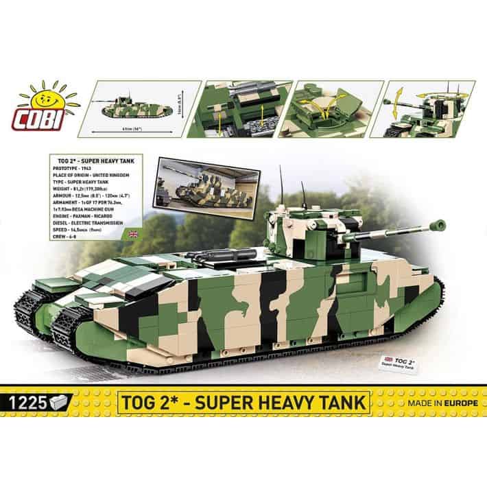 De TOG 2-set is ontwikkeld in samenwerking met COBI en het Bovington Tank Museum. De tank is uitgerust met een roterende koepel, een beweegbare loop en een gedetailleerde motor die zich onder een scharnierend serviceluik bevindt. Dankzij de werkende tanktractie kunt u het voertuig verplaatsen, bijvoorbeeld op een bureau of op de vloer.